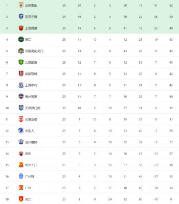 在积分榜方面,山东泰山20胜2平3负,积62分,暂列第一;武汉三镇19胜2平4负,积59分,暂列第二;上海海港15胜4平6负,积49分,暂列第三;浙江队11胜10平4负,积43分,暂列第四。