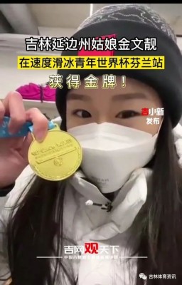 芬兰当地时间11月27日,在国际滑联速度滑冰青年世界杯芬兰站的比赛中,吉林籍速度滑冰运动员金文靓在女子新成年组1500米的比赛中表现出色,以2分09秒51斩获冠军,这是本赛季中国速度滑冰队继速滑世界杯取得2金之后的又一金牌,同时也是金文靓个人运动生涯获得的首枚国际赛事金牌。