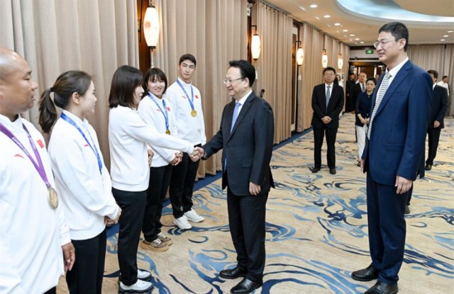9月8日,在吉林省第十九届运动会暨省残运会开幕前,省委书记景俊海,省委副书记、省长胡玉亭在梅河口市接见奥运会冠军武大靖、宫金杰、周洋、李坚柔,残奥会冠军付彦龙等我省优秀运动员和体育工作者代表。