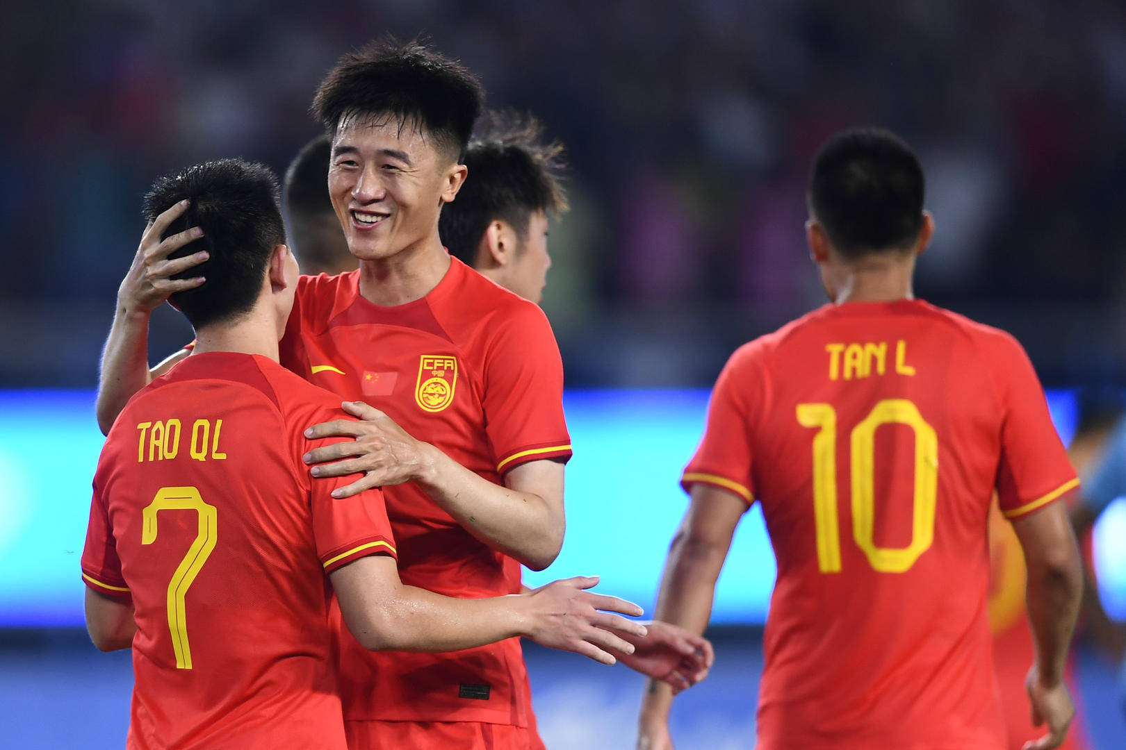 杭州亚运会男足小组赛A组首轮,中国亚运队庆祝进球 图据IC photo