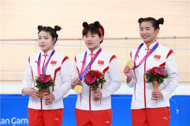场地自行车女子团体竞速赛中国队摘金。9月26日,在杭州亚运会场地自行车女子团体竞速赛决赛中,我省运动员苑丽颖携手队友鲍珊菊、郭裕芳,以46秒376的成绩,战胜韩国队夺冠,并打破亚洲纪录,五星红旗再次飘扬在亚运赛场。