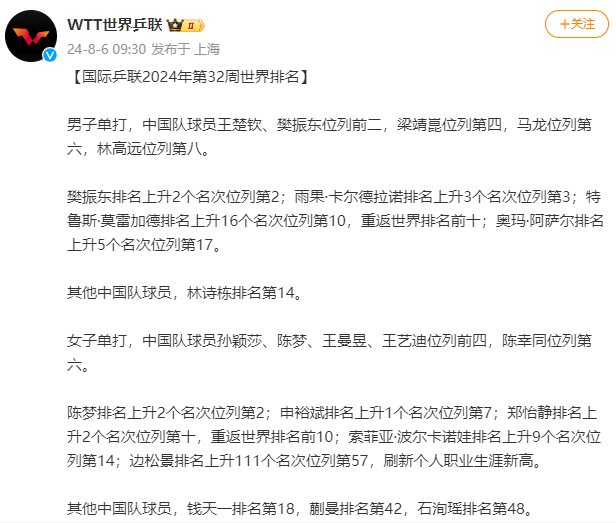 新京报讯 据WTT世界乒联官博消息,国际乒联2024年第32周世界排名公布。