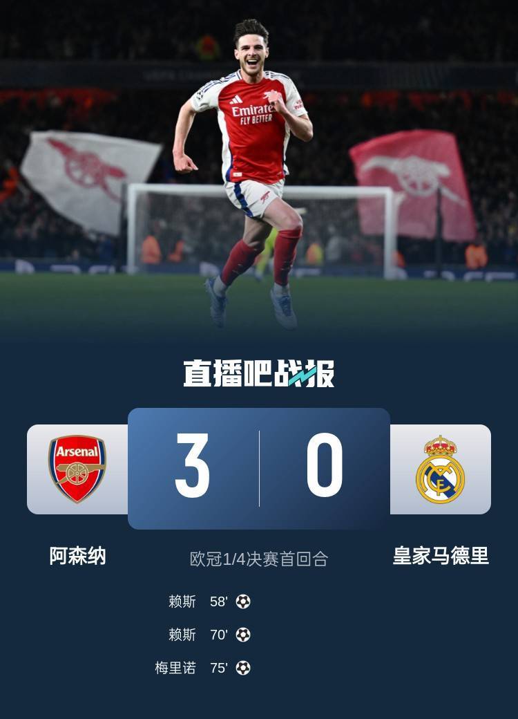 欧冠1/4决赛首回合,阿森纳主场3-0战胜皇家马德里,赖斯梅开二度,梅里诺进球。
