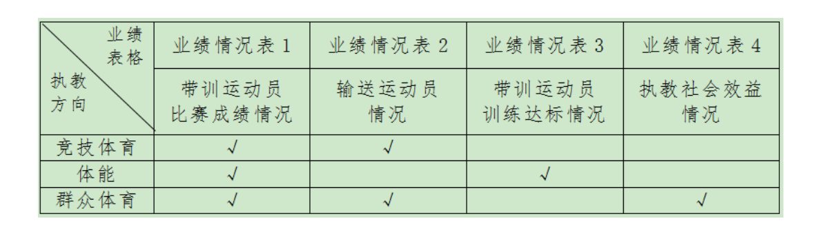 3.申报人在本人执教方向内,据实填报1个或多个业绩情况表。执教方向与业绩情况表填报关系见下表。
