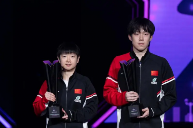 9月14日进行的2025年世界乒乓球职业大联盟(WTT)澳门冠军赛上,中国选手王楚钦(右)和孙颖莎(左)分别获得男单和女