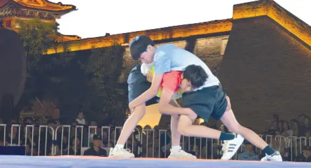 子夜将近,广场上的射灯次第熄灭,古城的喧嚣渐渐散去,唯有几盏路灯投下暖光。几个意犹未尽的少年仍在兴奋地复盘,清脆的笑语在清凉夜风中碰撞,汗湿的衣衫紧贴着尚未宽阔的脊背,影子在青石板上跳跃、拉长,仿佛是跤乡的昨日和明天在紧紧相拥。