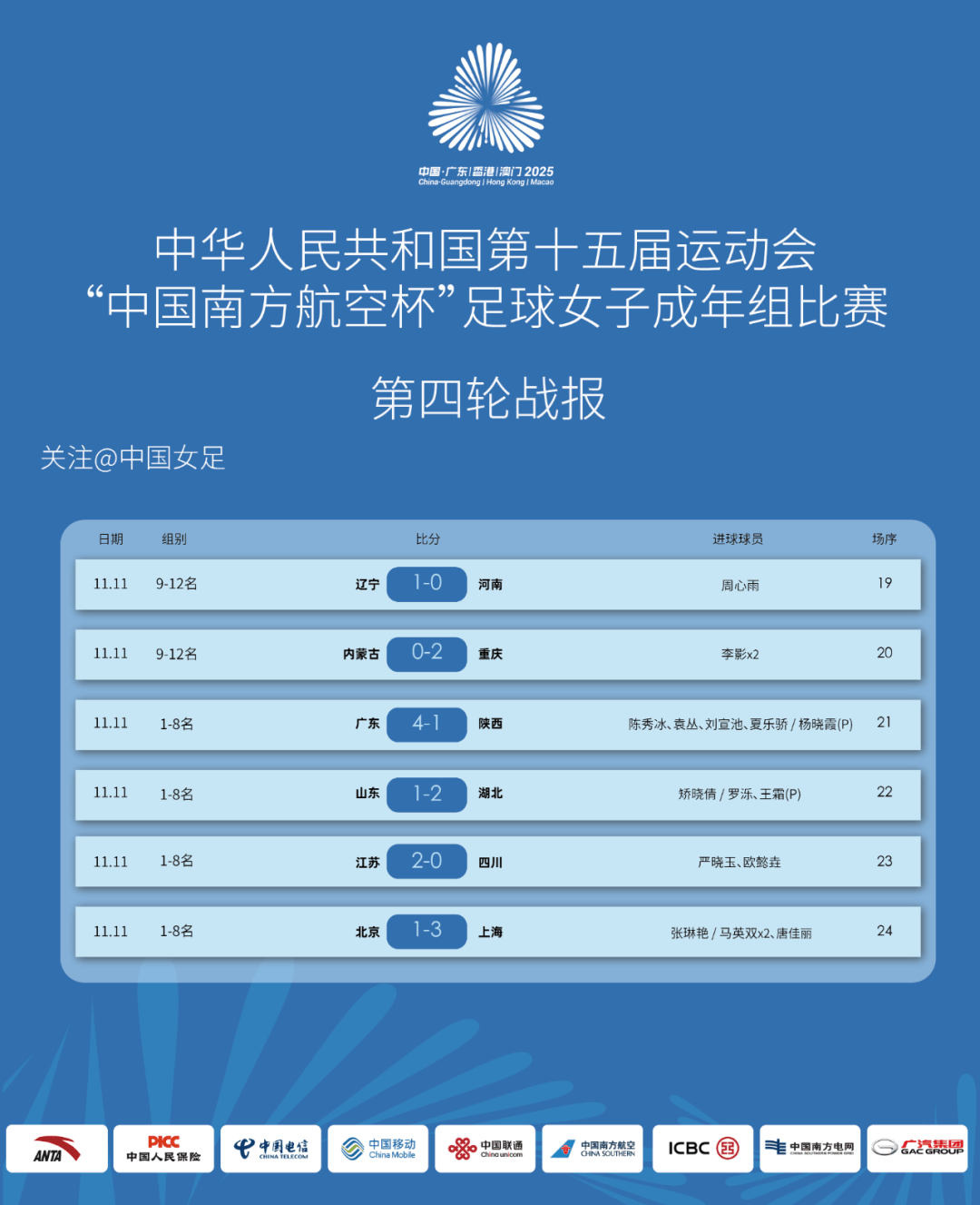 广东队、湖北队、江苏队和上海队晋级十五运会女足成年组四强。