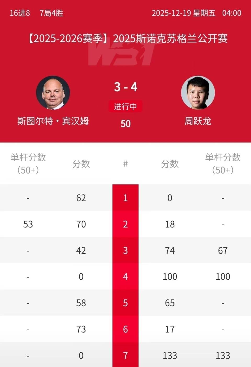 凌晨4:00这个时间段,周跃龙强势出战,他的对手是2015年世锦赛冠军斯图尔特-宾汉姆。此役,周跃龙以0-2开局。非常本轮的局面下,周跃龙强势反击,他轰出一波三连鞭,3-2反超比分并赢得赛点。宾汉姆在第六局将比分追成3-3,周跃龙在第七局单杆破百,总比分4-3绝杀晋级。这周跃龙和江俊、常冰玉!