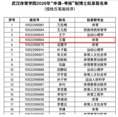 北京时间1月4日,武汉体育学院研究生院2026年“申请-考核”“硕博连读”博士研究生拟录取名单公示,女足国脚王霜名列其中。根据拟录取名单显示,王霜拟录取专业为体育专业。