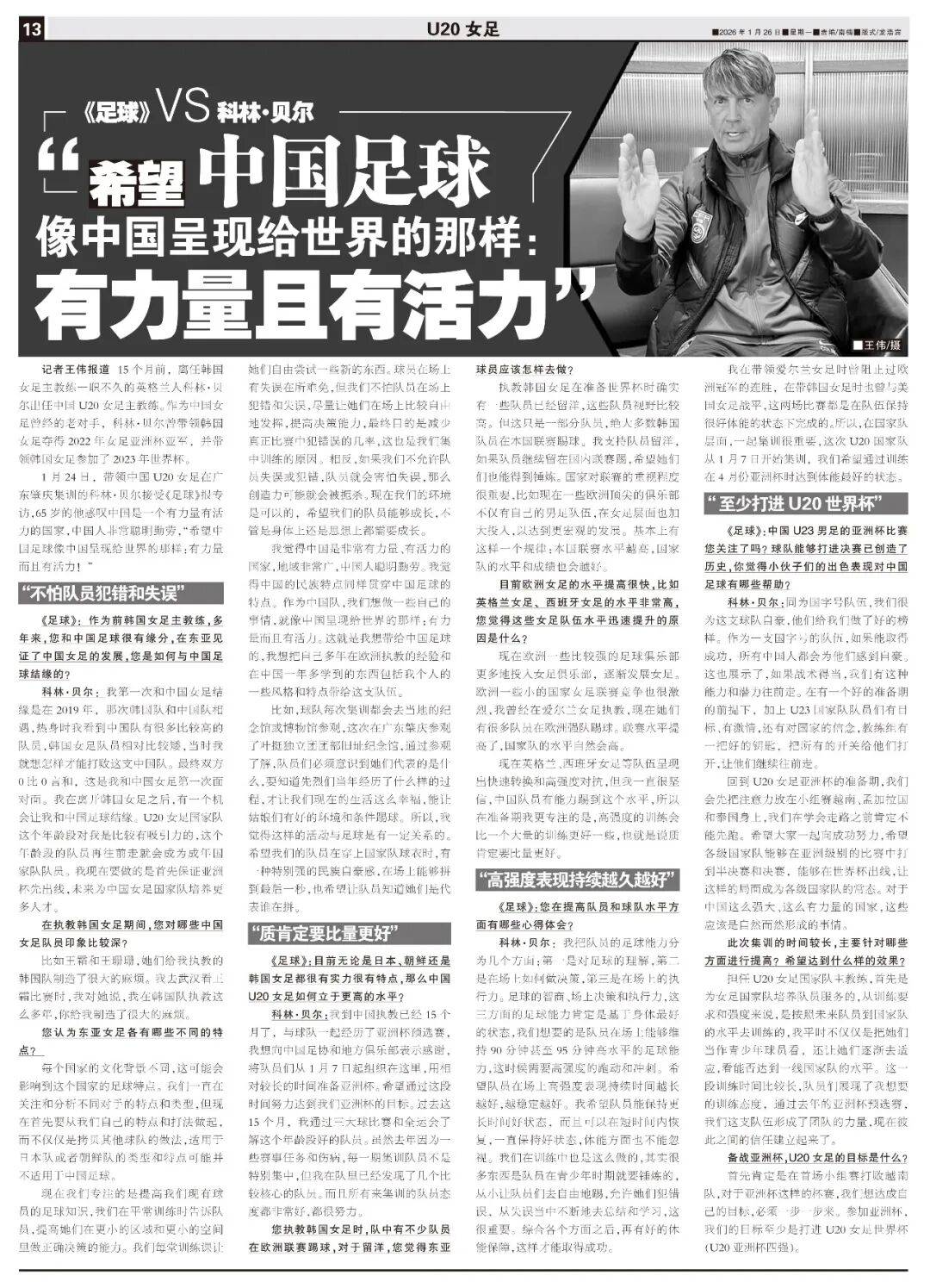 1月24日,带领中国U20女足在广东肇庆集训的科林·贝尔接受《足球》报专访,65岁的他感叹中国是一个有力量有活力的国家,“希望中国足球像中国呈现给世界的那样:有力量而且有活力!”