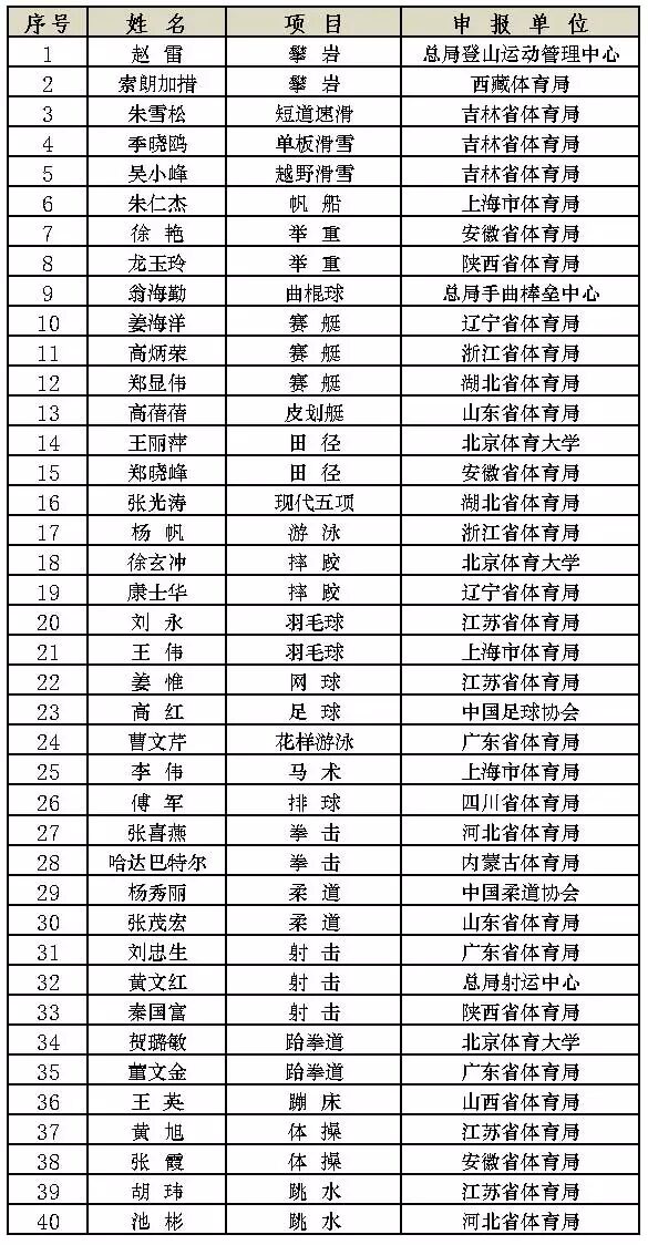 根据《国家体育总局精英教练员双百培养计划实施办法》,经单位申报、专家评审、项目中心审核、专家答辩和公示等环节,现确定赵雷等40名教练员为2018-2020年精英教练员双百培养计划专业队资助对象(名单见附件)。体育总局将对专业队教练员每人资助30万元,分3年拨款。