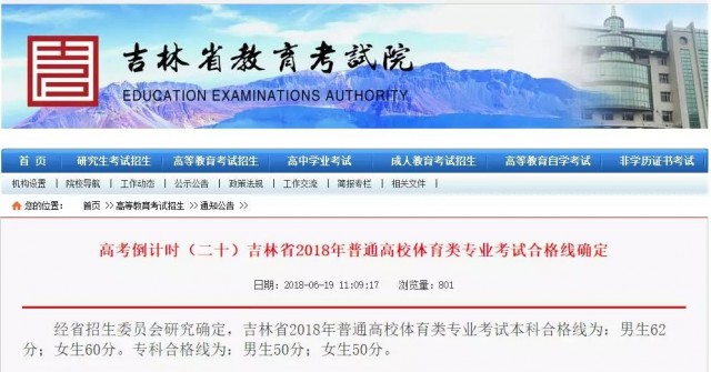 经吉林省招生委员会研究确定,吉林省2018年普通高校体育类专业考试本科合格线为:男生62分;女生60分。专科合格线为:男生50分;女生50分。