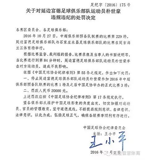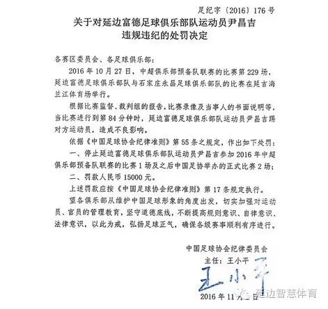 11月7日晚,中国足协在其官方网站上公布了最新一批处罚结果。其中延边富德足球俱乐部球员尹昌吉和朴世豪因在与石家庄永昌的预备队比赛当中,攻击对方运动员,遭到中国足协纪律委员会处罚。