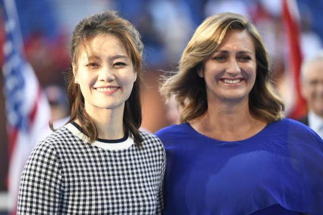 李娜穿了一袭灰色格子短裙,和一身蓝裙的皮尔斯站在前排。而包括罗德-拉沃尔、麦肯罗、张德培等网球名宿站在他们身后。